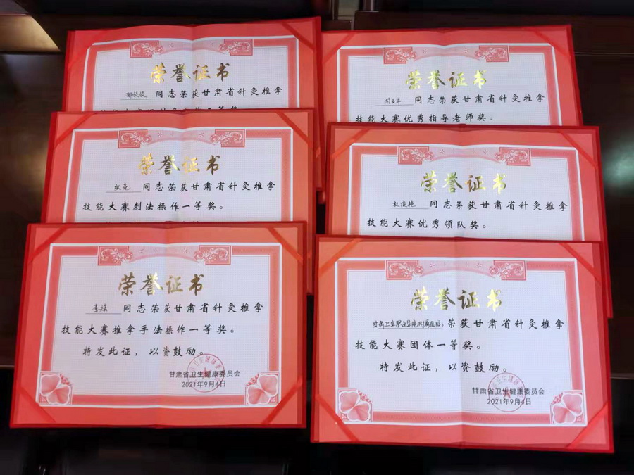 经过激烈角逐,张亮荣获刺法操作个人一等奖、李斌荣获推拿手法个人一等奖、郁姣姣荣获温针灸操作个人三等奖,甘肃省总工会拟推荐3位老师为2021年甘肃省“技术标兵”,学校附属医院荣获团体一等奖,同时,付亚平副主任医师荣获优秀指导老师奖、杜俊艳副主任护师荣获优秀领队奖。