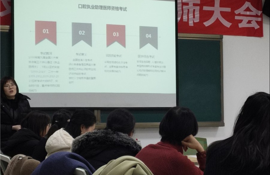 为加强口腔医学专业的专业建设和人才培养质量,口腔医学系不断总结执考经验,积极探索提升执考通过率的方法。一是积极组织考试情况交流会。2019年11月份组织全体专业教师、辅导员、在校生、2019届毕业生代表对2018届毕业生执考考试成绩进行了汇报与分析,同时邀请考生代表就备考过程进行了经验分享与交流。二是对接考试大纲组织专业教学研讨会,多次组织师生展开“教与学”研讨与反思。授课教师明确教学导向,优化课程设计,推进教学改革,帮助毕业生尽早达到职业准入标准,将培养学生的“岗位胜任力”落到实处,提高人才培养质量。三是制定了毕业生追踪辅导工作方案。由专人负责建立毕业生长久联系群,不仅通过教学平台定期推送与医师考试相关的视频和练习题,还在考前加强针对执考的培训,使毕业后的学生在医师考试前复习有的放矢,增强复习备考的信心。